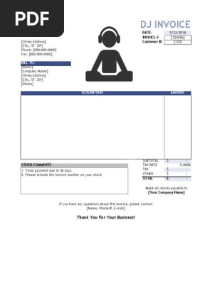 Simplify your accounting keep track of bank account movements and the status of invoices. We offer the opportunity to specify as many payment methods as you need in dj invoice template for pdf. Skynovas invoice template helps DJs like yourself create customized invoices in minutes.